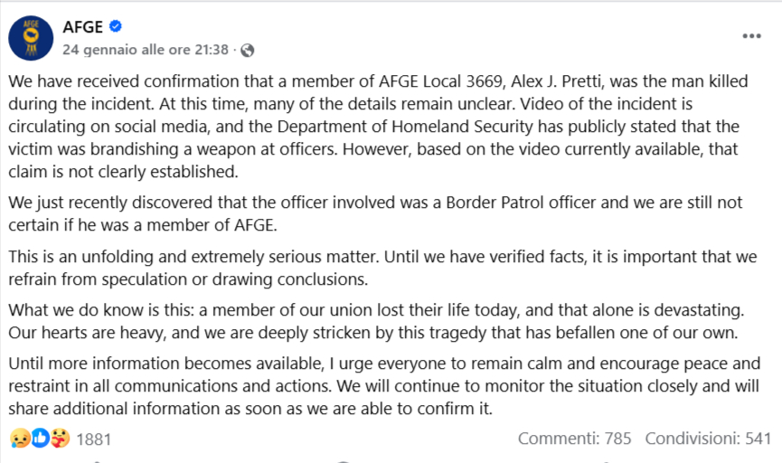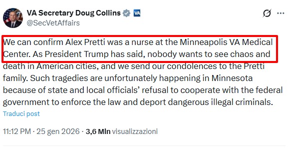In ogni caso, Alex Pretti non lavorava presso una struttura (inesistente) chiamata “Lakeshore Medical Center”, ma presso presso il Minneapolis VA Medical Center (che esiste), come confermato nel comunicato del Segretario degli Affari dei Veterani degli Stati Uniti, Doug Collins, al quale si aggiunge quello del senatore Richard Blumenthal.