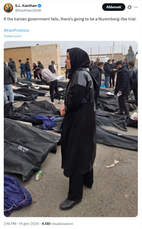 Mentre le proteste in Iran continuano a causare un alto numero di vittime, sui social circolano immagini sempre più scioccanti per raccontare la repressione del regime. Una di queste mostra una donna davanti a una distesa apparentemente infinita di sacchi neri con i cadaveri dei manifestanti. L’immagine, però, non corrisponde alla realtà.