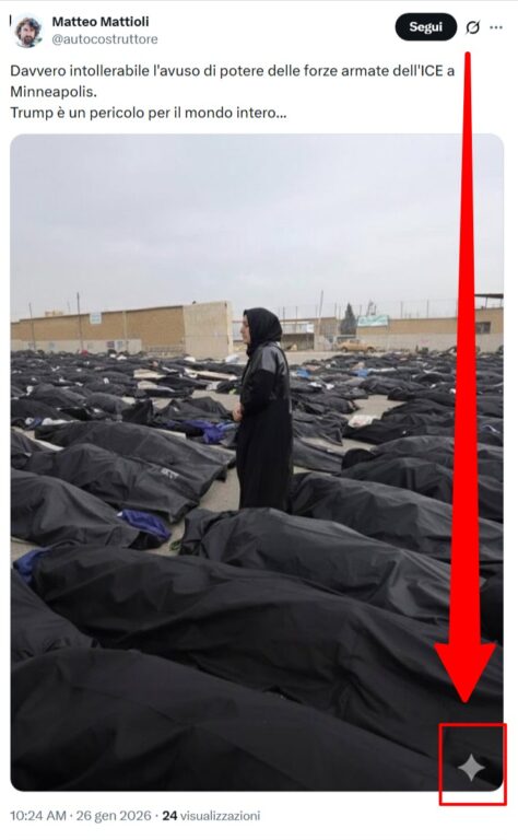 Ciò dimostra che l’inquadratura è, di fatto, stata alterata con l’uso dell’AI, generando decine di sacchi neri oltre a quelli già presenti, aumentando il modo sensazionalistico il numero delle vittime e rimuovendo le altre persone presenti sul posto, concentrandosi solo sulla donna.