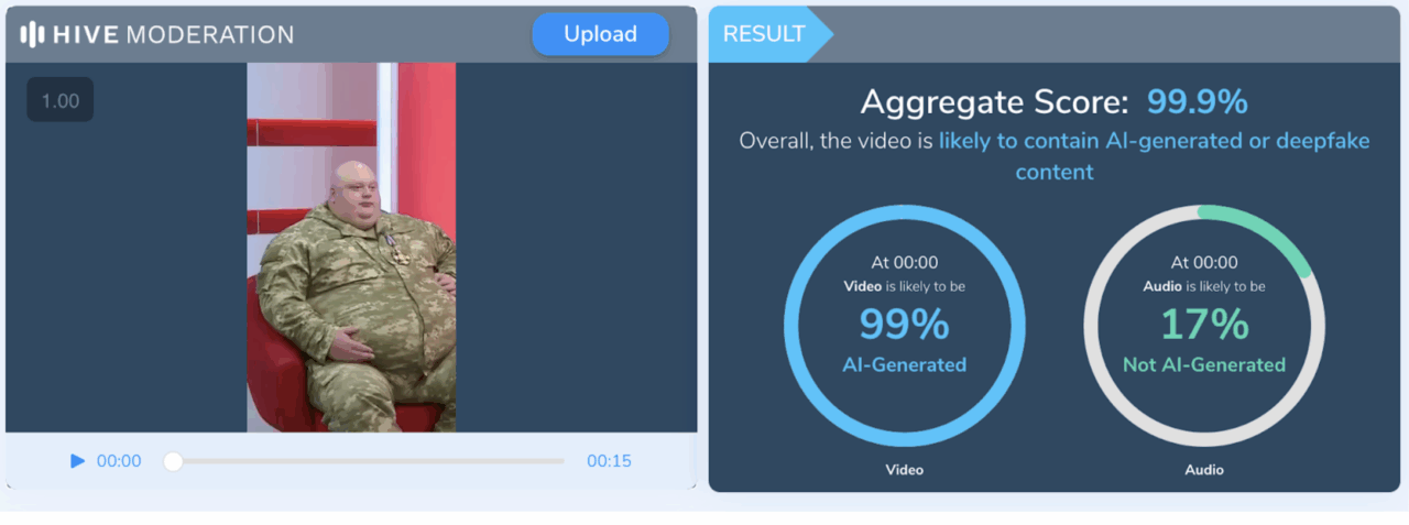 «Hive Moderation e DeepFake-O-Meter hanno valutato il video come generato dall’IA. DeepFake-O-Meter, sulla base di tre indicatori, ha valutato il video come il 90% di probabilità che sia stato generato dall’intelligenza artificiale, mentre Hive Moderation lo ha valutato al 99%».
