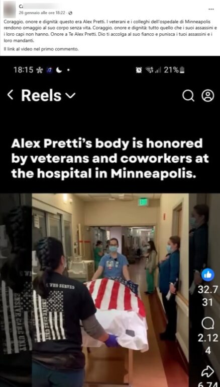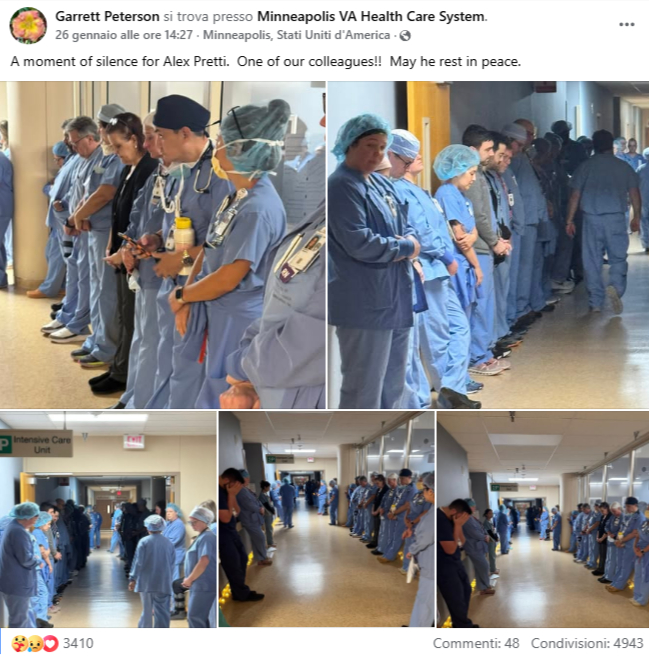 Dopo l’omicidio di Alex Pretti, circola un video che riprenderebbe l’omaggio dei colleghi dell’ospedale di Minneapolis, schierati in silenzio nei corridoi della struttura e onorando un feretro coperto dalla bandiera americana. Si tratta, in realtà, di una scena decontestualizzata che non ha nulla a che fare con l’omicidio dell’infermiere americano.