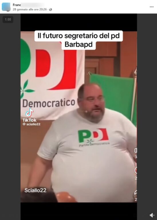 Circola il video di un uomo, estremamente in sovrappeso, che parla davanti a un pubblico e attacca gli Stati Uniti (definendoli “impero americano”), accusati di voler affamare i popoli in Medio Oriente e nel Nord Europa. Il video viene presentato come l’intervento di un esponente del Partito Democratico, accompagnato da una scritta derisoria: “Il futuro segretario del PD BarbaPD”. Si tratta di una scena generata con l’AI.