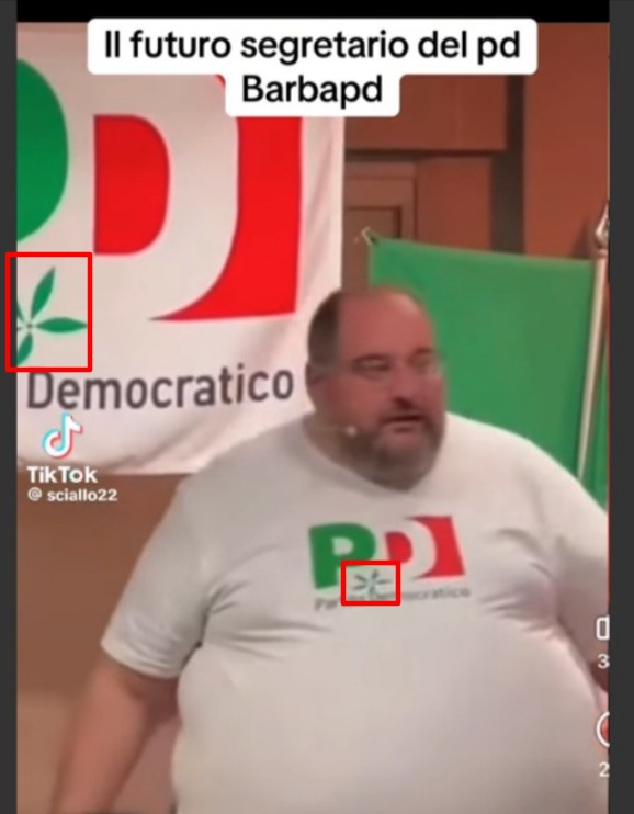 Oltre alla brevità del video, e all’assenza di riscontri su un evento del genere, l’elemento più evidente della generazione tramite l’AI è visibile nel logo del PD presente sia nello sfondo che nella maglietta dell’uomo.