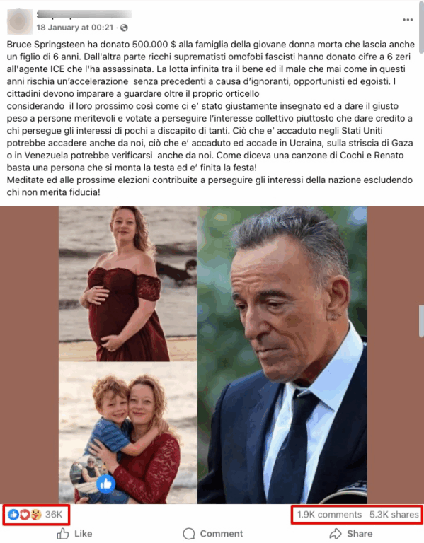 I contenuti virali sono accompagnati da immagini emotive, come foto di Renee incinta o con il figlio, e da testi che contrappongono “il bene” di Springsteen al “male” delle donazioni all’agente Ice.