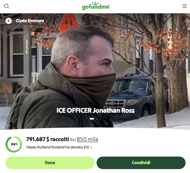 Per quanto riguarda le donazioni verso Jonathan Ross, l’agente dell’Ice identificato come autore dello sparo, c’è del vero. Il fundraiser esiste ed ha ricevuto migliaia di donazioni. Tra i donatori noti figura Bill Ackman, che ha versato 10.000 dollari, difendendo pubblicamente la sua scelta.