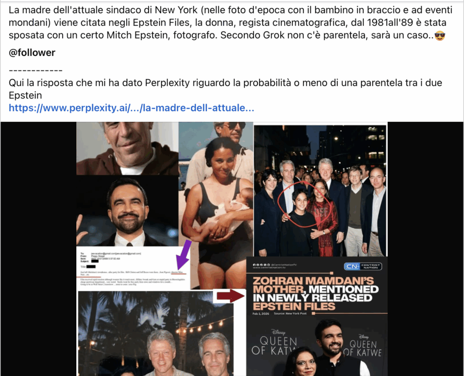 Abbiamo visto che le foto in oggetto sono dei meme satirici generati con l’IA. Per quanto la madre di Mamdani venga effettivamente menzionata negli Epstein files, questo non significa che fosse sua complice in attività illecite. Infatti le fonti non dimostrano questo. La voce secondo cui la donna avesse avuto una relazione con Epstein da cui sarebbe nato il futuro sindaco di New York è totalmente campata in aria.