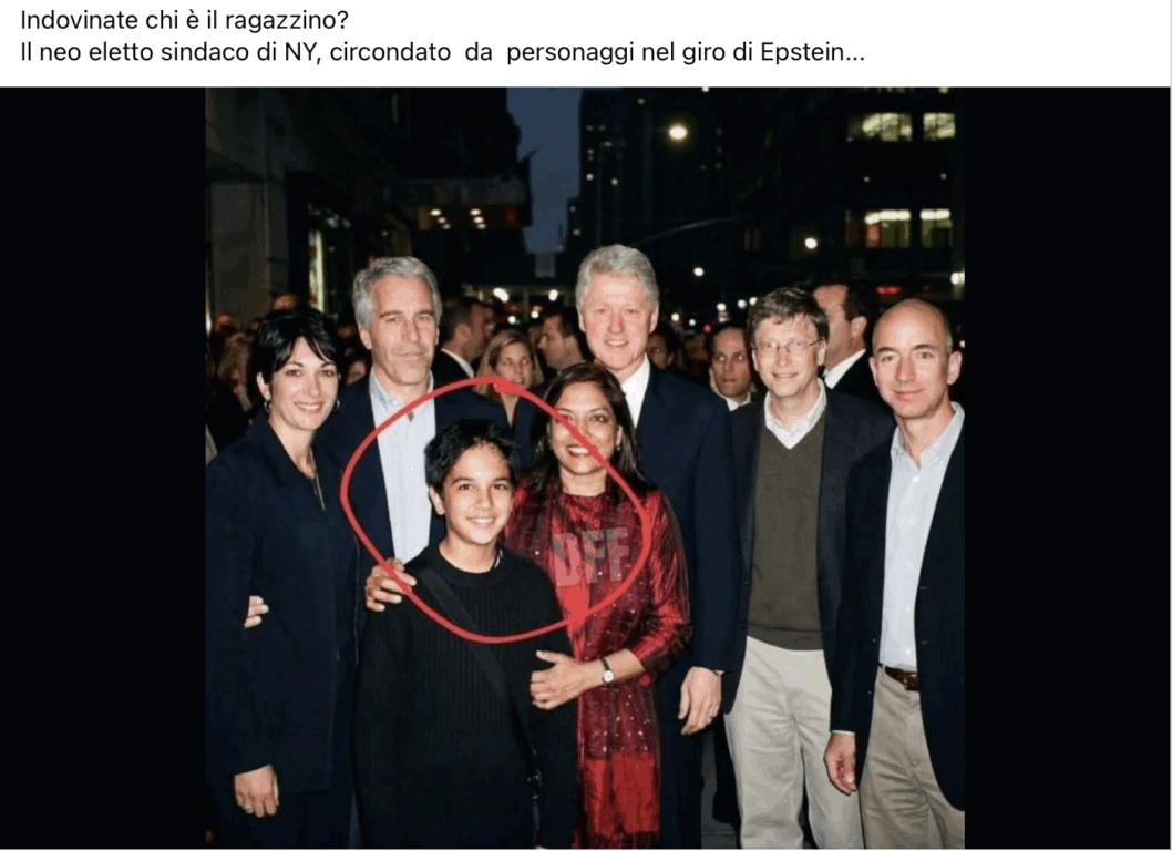 Diverse condivisioni Facebook (per esempio qui, qui e qui) suggeriscono che la madre del sindaco di New York Zohran Mamdani fosse in qualche modo complice – o che avesse una relazione – con Jeffrey Epstein, il miliardario condannato per abusi sessuali e traffico di minori. La madre di Mamdani, la regista Mira Nair, citata negli Epstein files, sarebbe stata immortalata in diverse foto con in braccio il piccolo Zohran, assieme a Epstein, la compagna e complice Ghislaine Maxwell, Bill Clinton, Bill Gates e Jeff Bezos. Il re dei complottisti americani, Alex Jones, sostiene addirittura che Mamdani possa essere figlio illegittimo di Epstein.