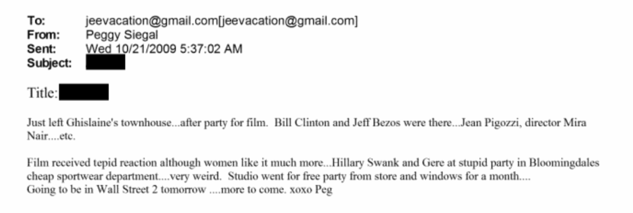 Fa specie che il documento più citato sia anche il primo che compare facendo la ricerca. Non è altro che la mail della PR di Epstein, Peggy Siegal, dove si citano gli invitati al party: