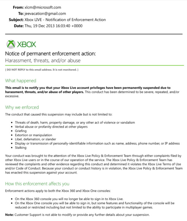 All’interno del documento EFTA00634104, tra i primi presenti nella ricerca, troviamo una mail automatica inviata dal team “Xbox Live Policy & Enforcement”, che comunica a Epstein la sospensione definitiva del suo account per “harassment, threats, and/or abuse of other players”. Il messaggio elenca una lunga serie di possibili violazioni, tra cui minacce di morte, abusi verbali, stalking, griefing, estorsione e diffusione di dati personali.