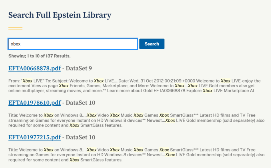Consultando il dataset del Dipartimento, ci sono ben 137 file in cui troviamo la parola Xbox associata a Epstein. Non tutte le mail riguardano il gioco effettivo, mentre alcune fanno riferimento a proposte di regalo o acquisti legati alla console.