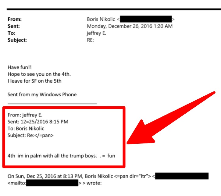 La corrispondenza tra Epstein e Nikolic risale al 25 dicembre 2016, a poco più di un mese di distanza dalla prima elezione di Donald Trump a presidente degli Stati Uniti. Nel rispondere al suo interlocutore, Epstein afferma che il 4 gennaio 2017 si troverà a Palm Beach insieme a tutti i “Trump boys”, sottolineando quanto l’incontro risulterà piacevole per lui (“= fun“).