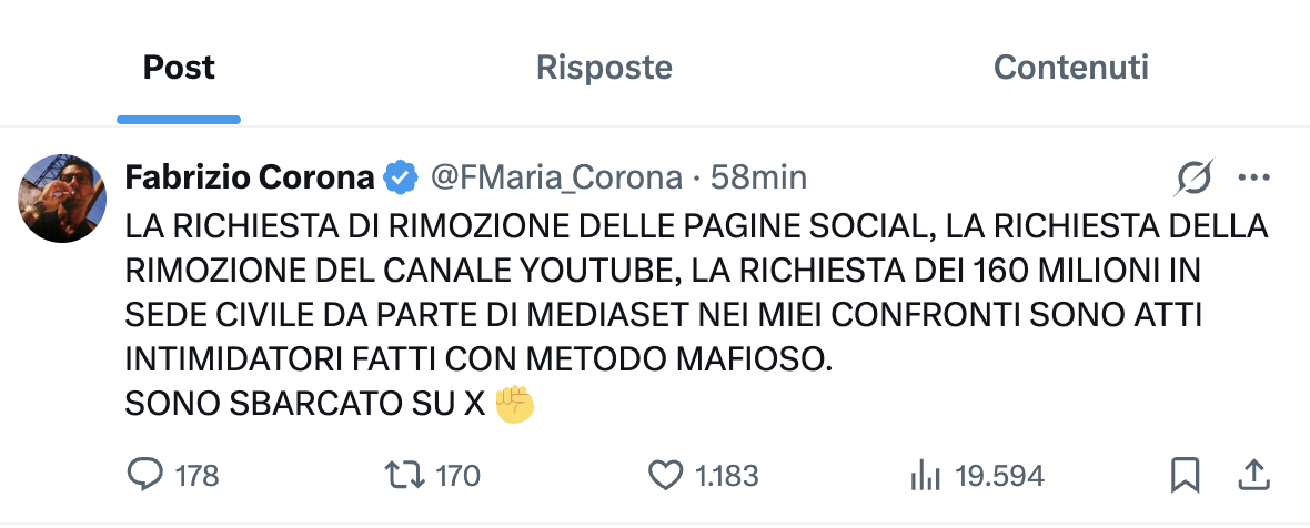 Cancellato un social, se ne apre subito un altro. Fabrizio Corona è approdato su X. Il suo primo post è un attacco durissimo a Mediaset. Per l’ex agente fotografico la richiesta di rimozione delle pagine social e del canale YouTube, dove venivano pubblicate le puntate di Falsissimo, e la richiesta dei 160 milioni in sede civile sono tutti «atti intimidatori». L’apertura del profilo sul social di Elon Musk era stata annunciata poco prima su una chat di Telegram, in cui aveva scritto «sono atterrato su X».