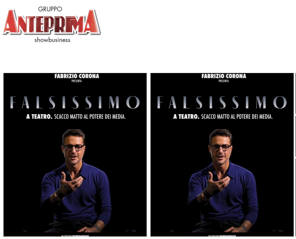 E mentre la querelle va avanti, Corona non si ferma e si fa beffe di tutto e tutti, portando sul palco teatrale Falsissimo, la trasposizione del format che negli ultimi mesi lo ha messo al centro di polemiche. «Fabrizio Corona nei teatri italiani. “Falsissimo in teatro – Scacco matto al potere dei media”», annuncia un comunicato diffuso da Gruppo Anteprima. Nello stesso avviso compaiono anche le prime date del tour, tutte concentrate nel mese di maggio: si parte da Milano il 7 maggio all’Eco Teatro, per poi proseguire a Catania il 14, Napoli il 21, Roma il 22 e Padova il 23.