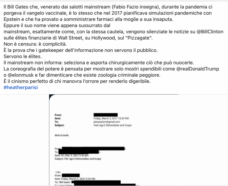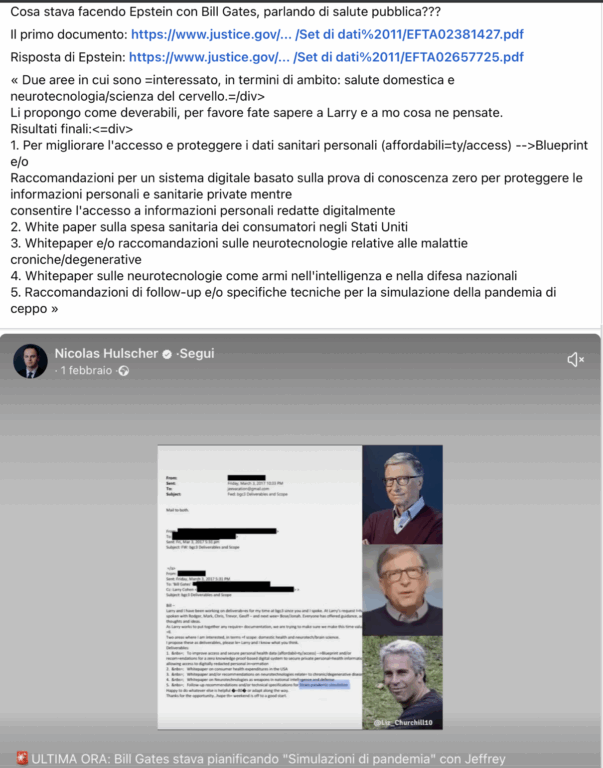 Diverse pagine apprezzate dagli utenti che seguono le teorie del complotto, stanno condividendo su Facebook di versi post dove si sostiene che Bill Gates e Jeffrey Epstein stessero pianificando una simulazione pandemica nel 2017 (per esempio qui e qui). Tutto si basa su un paio di eMail pubblicate nel più ampio contesto degli Epstein files (i documenti EFTA02381427 ed EFTA02657725). Senza un contesto questi file si amalgamano con altri “meme” tipici delle narrazioni cospirazioniste; come «élites finanziarie», il «Pizzagate»; o domande tendenziose, come «Cosa ci faceva Epstein con Bill Gates, parlando di salute pubblica?»