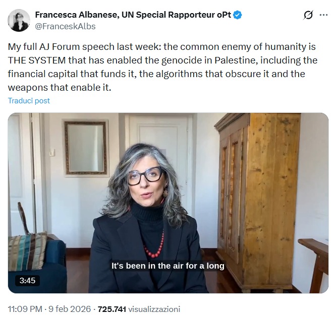 La formulazione citata nell’articolo de Il Fatto corrisponde invece alla spiegazione fornita successivamente da Albanese in un messaggio pubblicato su X. Nel video, infatti, la parola «sistema» non viene mai utilizzata nel passaggio oggetto della polemica.