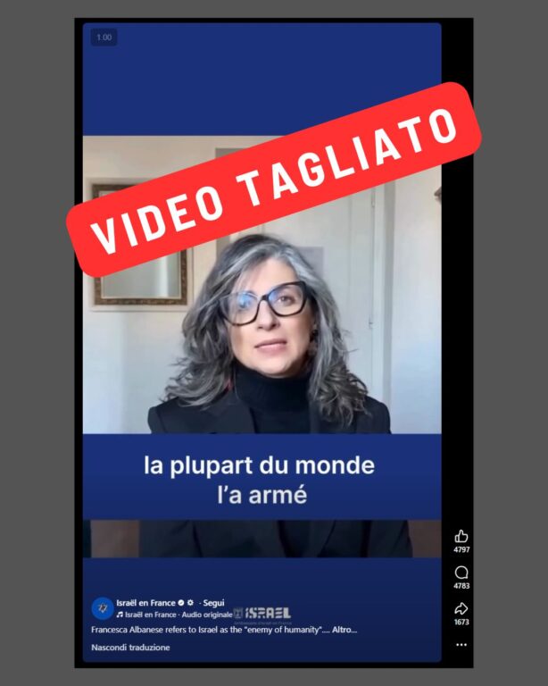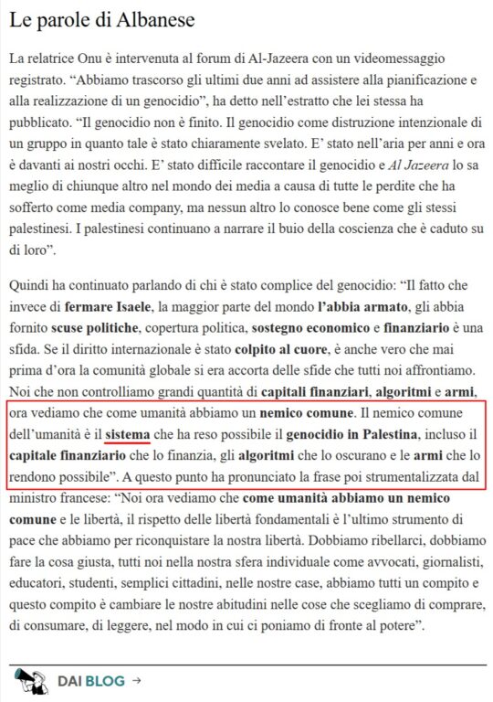 L’associazione nasce dalla sequenza del discorso, attraverso un intervento interamente centrato su accuse a Israele seguito dall’affermazione secondo cui l’umanità ha un «nemico comune». Anche quando, in seguito, Albanese parla di «sistema», questo viene presentato come ciò che avrebbe consentito o coperto l’azione attribuita a Israele.