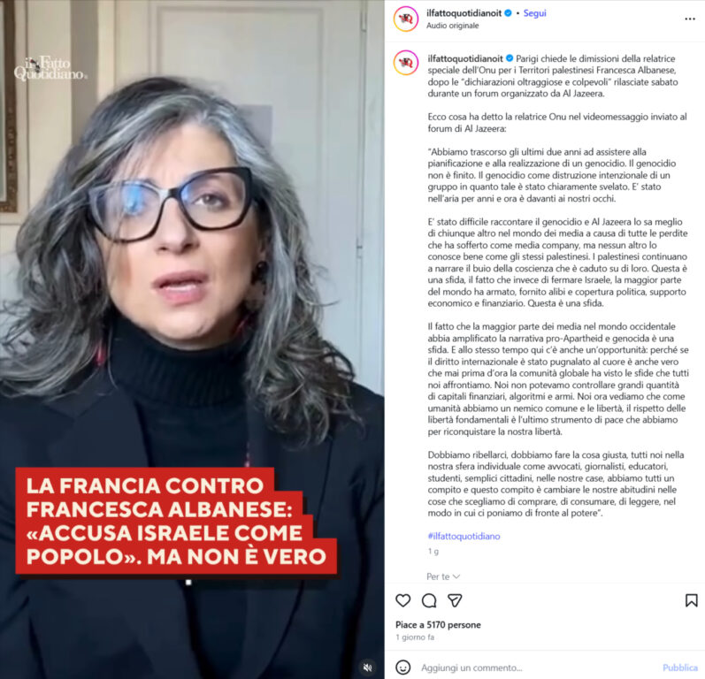In alcune ricostruzioni giornalistiche la formulazione sul «sistema» viene riportata insieme al discorso, mentre nella trascrizione integrale tale parola non compare affatto. Come segnalato da Mattia Madonia, è quanto avvenuto in un articolo de Il Fatto Quotidiano pubblicato l’11 febbraio 2026 dal titolo «La Francia chiede le dimissioni di Francesca Albanese da relatrice Onu: “Accusa Israele come popolo”. Ma non è vero – Il video».