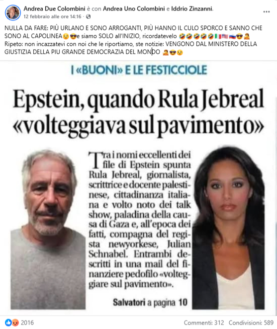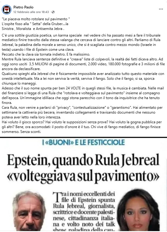 Circola lo screenshot di un articolo con un titolo allusivo e una frase tra virgolette: «Epstein, quando Rula Jebreal “volteggiava sul pavimento”». L’immagine, accompagnata da commenti e interpretazioni sui social, viene letta da diversi utenti come la prova di una presenza della giornalista ai festini del finanziere pedofilo citata negli Epstein Files. Ma è davvero ciò che emerge dai documenti?