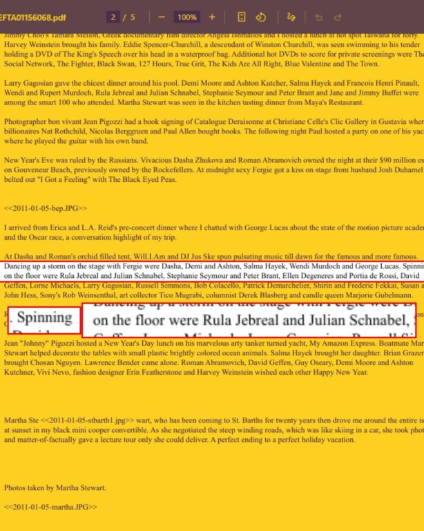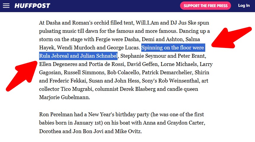 Nel testo originale in inglese si legge «Spinning on the floor were Rula Jebreal and Julian Schnabel». Ecco il paragrafo completo: