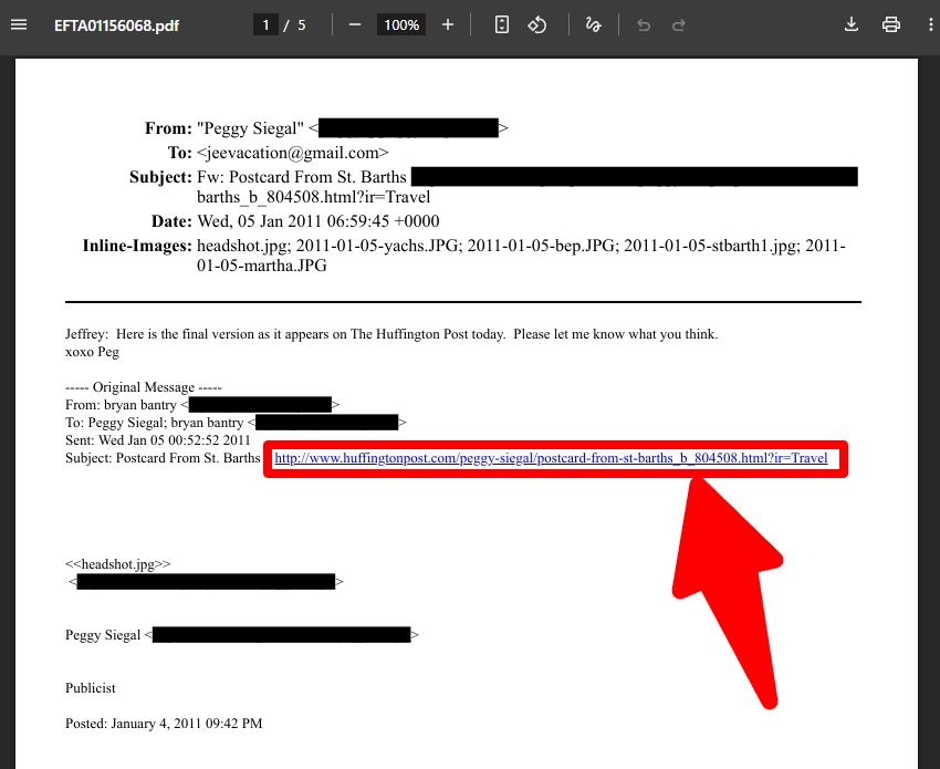 La frase ripresa nello screenshot non nasce da un verbale giudiziario né da un resoconto di una festa organizzata da Epstein. Compare in un articolo mondano intitolato “Postcard From St. Barths“, pubblicato all’epoca sull’Huffington Post (archiviato qui) e successivamente inoltrato via email a Jeffrey Epstein il 5 gennaio 2011 dalla PR Peggy Siegal.