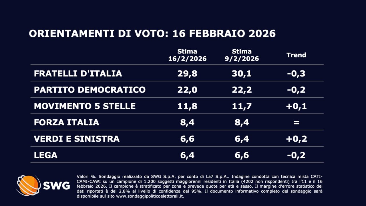 La rilevazione fotografa anche l’andamento delle principali forze politiche. Tra i partiti maggiori si registra una lieve flessione per Fratelli d’Italia (-0,3%), Partito Democratico (-0,2%) e Lega (-0,2%). Crescono invece Movimento 5 Stelle (+0,1%) e Verdi e Sinistra (+0,2%), mentre Forza Italia resta stabile. Tra le forze minori si segnala l’avanzata di Futuro Nazionale, la nuova formazione guidata da Roberto Vannacci, che guadagna lo 0,3%, rubando di fatto voti sia alla Lega che a Fratelli d’Italia. In crescita anche Azione (+0,2%) e Italia Viva (+0,1%). In lieve calo +Europa e Noi Moderati (-0,1% ciascuno), mentre restano invariati il dato delle altre liste e quello degli indecisi.