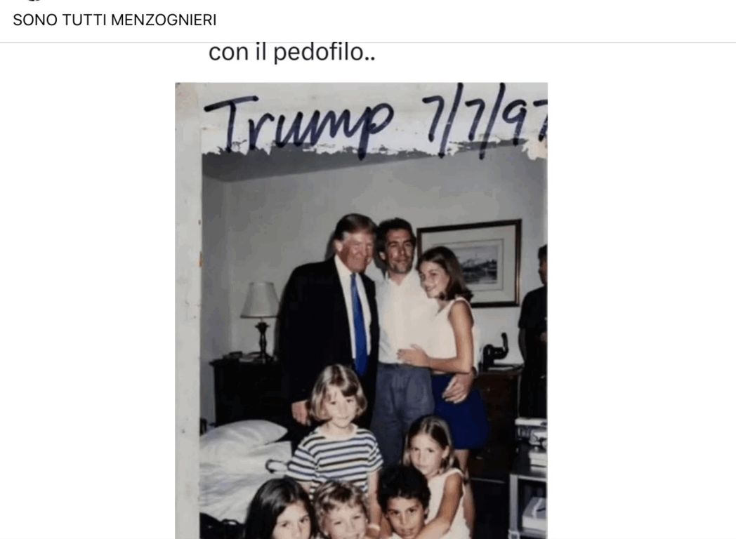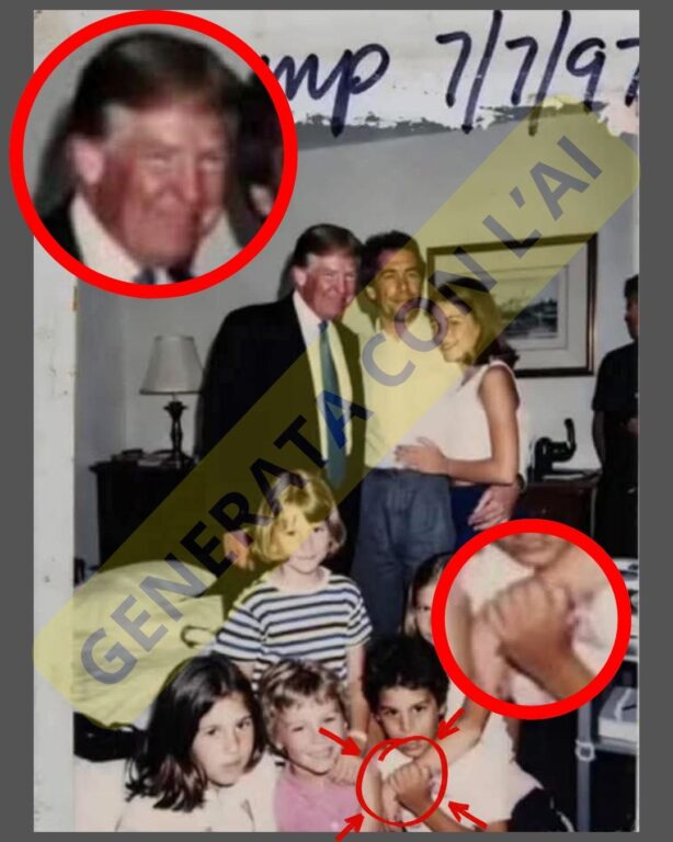 Diverse condivisioni Facebook stanno diffondendo un’immagine, che circola anche su X, dove si vede Donald Trump in posa assieme a Jeffrey Epstein attorniati da diversi minorenni. Si tratta però dell’ennesima immagine generata con Intelligenza artificiale.