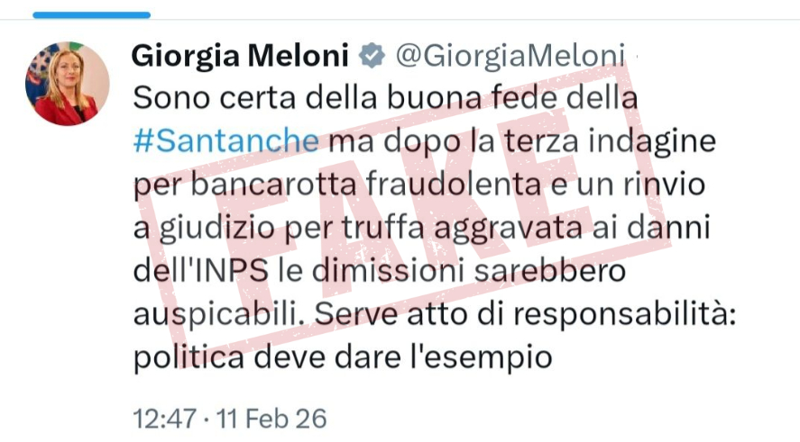 Circola lo screenshot di un post X attribuito a Giorgia Meloni, nel quale inviterebbe pubblicamente Daniela Santanchè, attuale ministro del Turismo, a dimettersi a seguito di indagini «per bancarotta fraudolenta e un rinvio a giudizio per truffa aggravata dai danni dell’Inps». Il post risulta datato 11 febbraio 2026, ma non c’è alcuna traccia di tale intervento né sulla piattaforma né nei media nazionali.