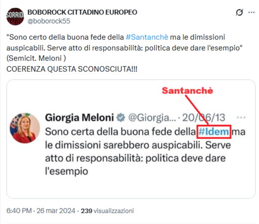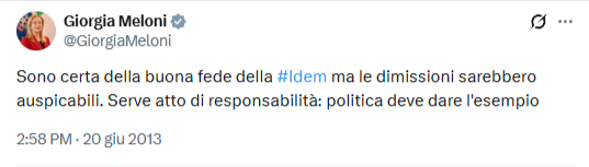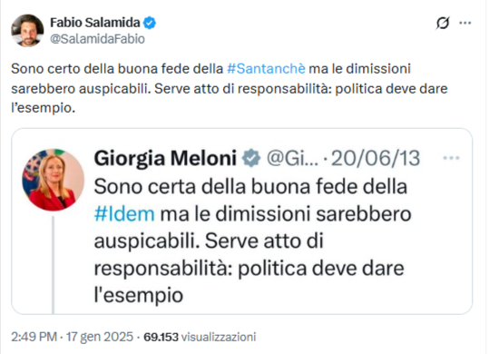 Sono certo della buona fede della #Santanchè ma le dimissioni auspicabili. Serve atto di responsabilità: politica deve dare l’esempio” (Semicit. Meloni)