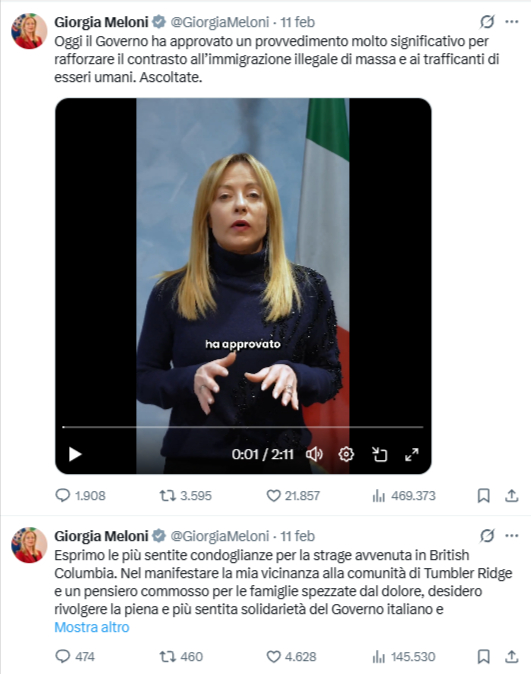 - L’11 febbraio 2026 Meloni ha pubblicato un solo post, alle 16:59, sulle condoglianze per una strage in British Columbia.