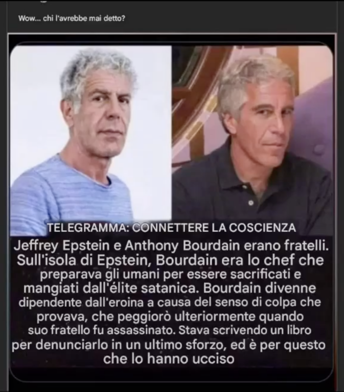 Non è chiaro come nasce questa narrazione. Sappiamo che fin dalla morte di Bourdain nel 2018 sono cominciate a circolare congetture riguardo ad un presunto omicidio, in quanto lo chef sarebbe stato in procinto di svelare l’esistenza di una élite pedofila, nel pieno “stile QAnon” dell’epoca. Per maggiori approfondimenti consigliamo l’analisi che scrisse all’epoca il collega David Mikkelson per Snopes. Così recentemente nei forum e nelle pagine dei Social network la narrazione si è “evoluta”, introducendo Epstein. La vaga somiglianza tra i due ha fatto il resto.