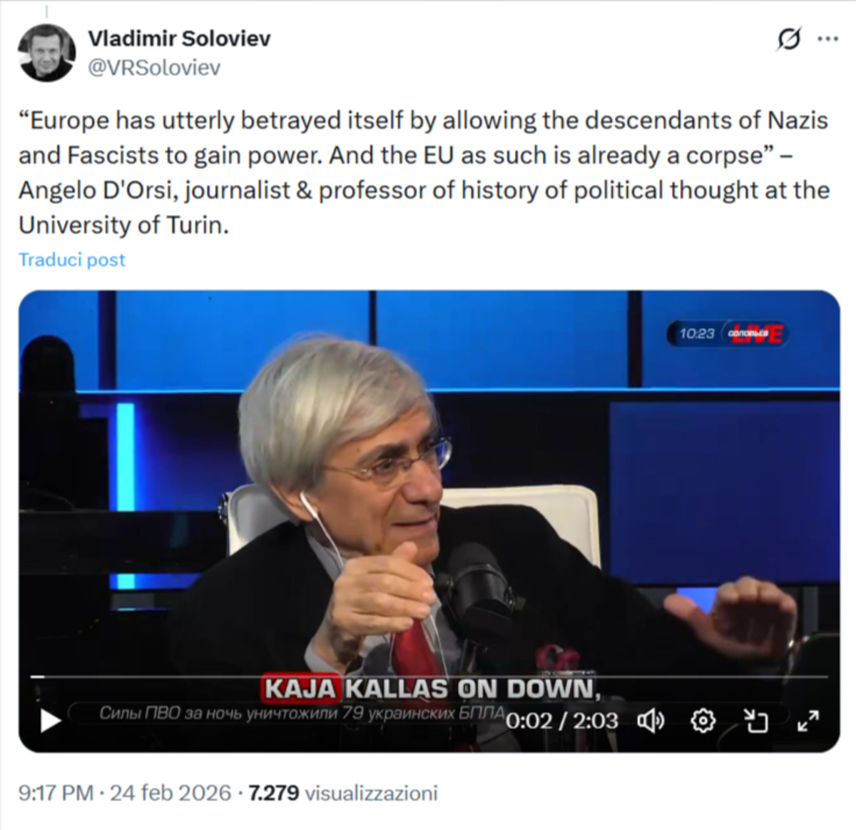 «Tutte loro, dalla Kaja Kallas in avanti, tutte loro sono eredi, anche sul piano biologico, di nazisti, di fascisti». L’uso del femminile plurale («tutte loro») da parte di d’Orsi, ritagliato appositamente da Soloviev, evidenzia un attacco che punta a colpire specificamente la leadership femminile europea.