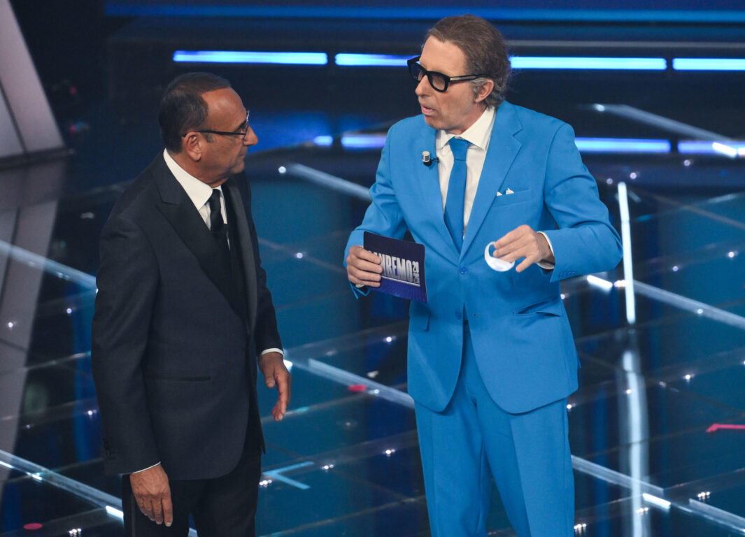 In quota comicità c’è invece Ubaldo Pantani: in completo tricolore come Lapo Elkann, “confonde” Sanremo con Che Tempo che Fa di Fazio, dove è ospite fisso. «Sono Carlo Conti» gli dice il padrone di casa. «Con gli occhiali da vista non ti avevo riconosciuto, faccio sempre confusione tra voi conduttori Rai». «Ma siamo su Rai1, non al Nove…». E lui ribatte: «Rai9 fa parte del grande bouquet di Sky, un’eccellenza italiana». A fine serata propone un brillante blob di allenatori, da Massimiliano Allegri a Luciano Spalletti, dal ct della Nazionale Rino Gattuso all’ex portierone Gigi Buffon, e di giornalisti, da Bruno Vespa a Massimo Giletti a Mario Giordano.