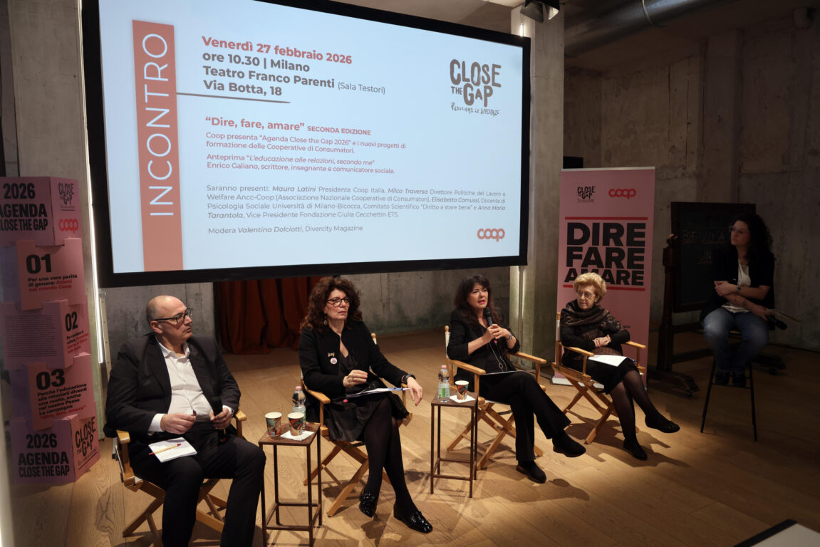 «Non vanno formati solo i giovani nelle scuola ma bisogna anche raggiungere gli adulti nelle aziende». A parlare è Anna Maria Tarantola, vicepresidente della Fondazione Cecchettin (che ricorda Giulia), durante l’evento Dire, fare, amare organizzato da Coop al Teatro Franco Parenti di Milano. Ed è proprio questo l’obiettivo, cioè cercare di creare spazi di riflessione pubblica per scardinare i pregiudizi di genere e promuovere un’educazione affettiva che in Italia fatica ancora a diventare realtà strutturale. Coop ha presentato così la sesta edizione di «Close the Gap», la campagna per l’inclusione che quest’anno punta tutto sulla prevenzione e sulla capillarità territoriale. Un impegno che si muove su due binari: la certificazione interna della parità di genere (già ottenuta da 4 delle 6 grandi cooperative) e una spinta culturale che coinvolge scuole, piazze e persino i reparti dei supermercati.
