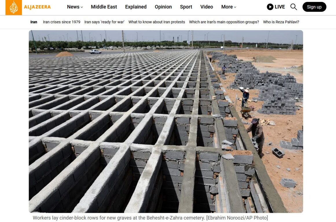 La foto venne pubblicata da Al Jazeera nel reportage fotografico intitolato “Sanctions-battered Iran faces worst coronavirus wave” e dall’Associated Press con la didascalia: “Workers lay cinder-block rows for new graves at the Behesht-e-Zahra cemetery”.