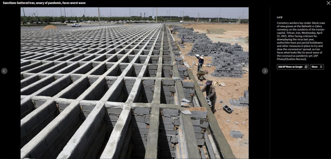 - La foto è stata pubblicata il 25 aprile 2021 dall’agenzia AP e ripresa da Al Jazeera: mostra operai che allargano il cimitero Behesht-e-Zahra di Teheran durante la quarta ondata di Covid-19 in Iran.
