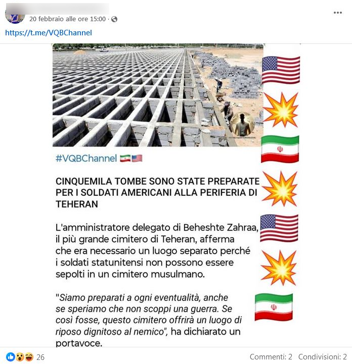 Un post social afferma che l’Iran avrebbe preparato cinquemila tombe per i soldati americani alla periferia di Teheran. La foto a corredo della notizia risale però al 2021 ed è stata scattata durante la peggiore ondata di Covid-19 nel paese.