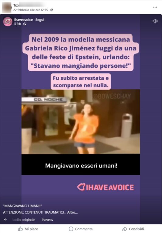 Nel 2009 la modella messicana Gabriela Rico Jiménez fuggì da una delle feste di Epstein, urlando: “Stavano mangiando persone!”. Fu subito arrestata e scomparse nel nulla.