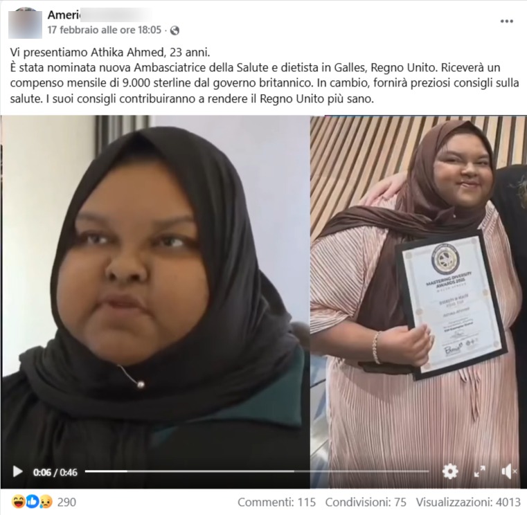 La narrazione secondo cui Athika Ahmed sarebbe stata nominata “Ambasciatrice della Salute e dietista in Galles” con uno stipendio mensile da 9.000 sterline pagato dal governo britannico è priva di fondamento.