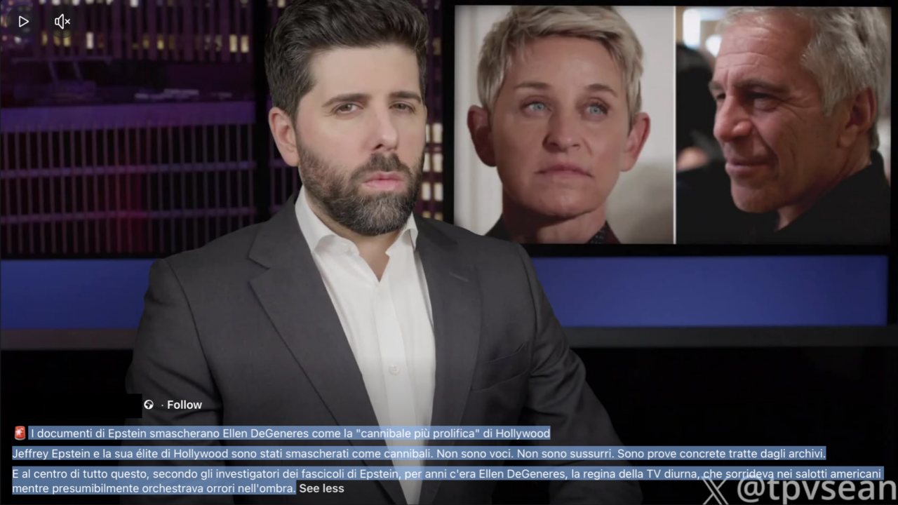 - Le condivisioni in oggetto riferiscono della presenza negli Epstein files di resoconti riguardo alla pratica del cannibalismo da parte di Ellen DeGeneres.