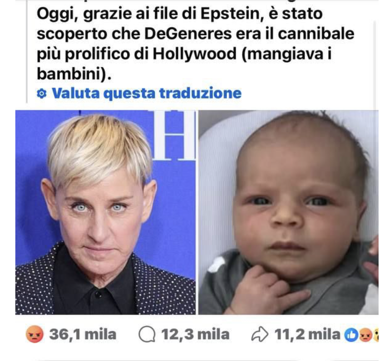 Diverse condivisioni Facebook (per esempio qui e qui) sostengono che negli Epstein files ci sarebbero le prove del fatto che la presentatrice e comica americana Ellen DeGeneres sarebbe stata una cannibale prolifica a danno dei bambini. Vediamo perché si tratta di una narrazione complottista priva di fondamento.
