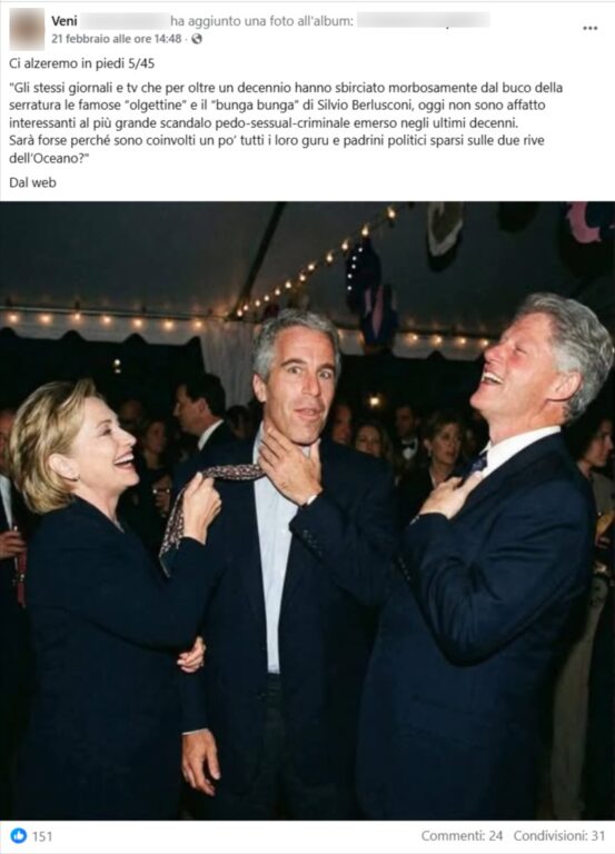 Davanti alla Commissione di sorveglianza della Camera, Hillary Clinton è stata ascoltata nell’ambito dell’indagine su Jeffrey Epstein. Durante la deposizione ha dichiarato che non era a conoscenza dei crimini del finanziere pedofilo, di non ricordare di averlo incontrato e che non è mai stata nella sua isola, né a casa sua o nei suoi uffici. A seguito della deposizione, è iniziata a circolare una foto che la ritrae mentre partecipa a un festino insieme al marito Bill mentre ridono insieme a Epstein. Hillary, in particolare, scherza con il finanziere tenendolo per la cravatta. Prova regina? No: intelligenza artificiale.