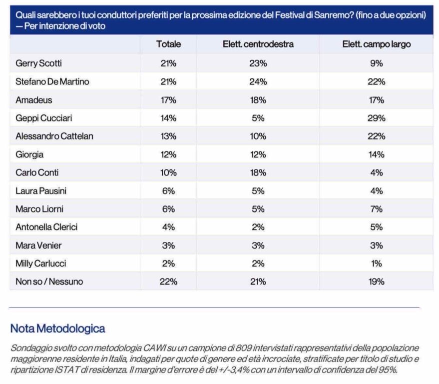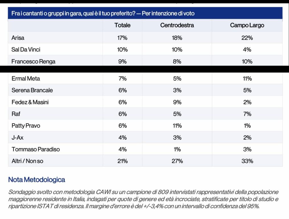 Arisa è l’unica che tiene trasversalmente: 18% nel centrodestra, 22% nel campo largo. Per il resto, le preferenze musicali ricalcano le appartenenze politiche. Patty Pravo raccoglie l’11% tra gli elettori di centrodestra e crolla all’1% nel campo largo. Fedez-Masini seguono la stessa direzione: 9% a destra, 2% a sinistra. Sul versante opposto Ermal Meta ottiene l’11% nel campo largo contro il 5% nel centrodestra. Sal Da Vinci è più apprezzato a destra (10%) che a sinistra (4%).