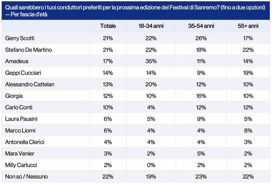 Carlo Conti ha fatto sapere che dirà la sua solo la sera della finale, ma il valzer dei nomi per la prossima edizione del Festival di Sanremo è già in pieno svolgimento. I rumors puntano con insistenza su Stefano De Martino, e i numeri sembrano dargli ragione. Secondo un sondaggio YouTrend (campione di 809 intervistati, metodologia CAWI, margine d’errore +/- 3,4%), De Martino è al 21%, alla pari con Gerry Scotti. Terzo Amadeus al 17%, che tra i 18-34enni resta imbattibile con un netto 35%. Geppi Cucciari è la donna più votata al 14%, davanti a Giorgia (12%). Lo stesso Conti si ferma al 10%, Laura Pausini al 6%. In fondo alla lista quattro volti storici di Rai 1: Liorni, Clerici, Venier e Carlucci, tutti sotto il 6%.