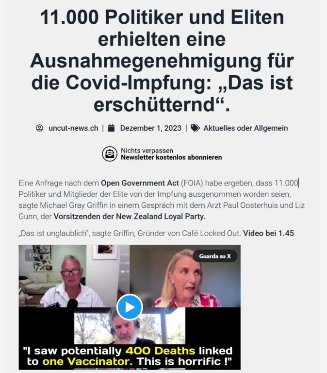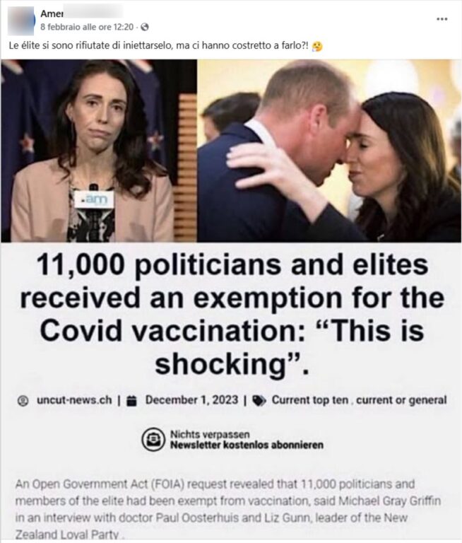 I post condividono la traduzione in inglese di un blog in tedesco, il quale si aggancia a un video pubblicato su X nel 2023, dove si sostiene che una richiesta FOI/Freedom of Information avrebbe rivelato “11.000 esenzioni” concesse soprattutto a politici ed élite. La cifra viene spesso accostata all’ex premier neozelandese Jacinda Ardern.