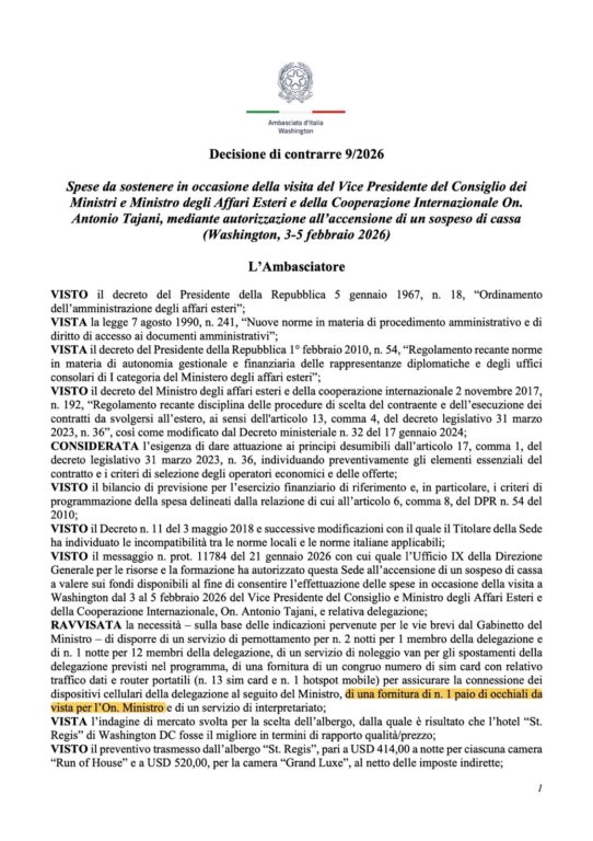 La determina di Peronaci è stata firmata dopo che dal ministero in Italia è arrivata l’autorizzazione «all’accensione di un sospeso di cassa a valere sui fondi disponibili al fine di consentire l’effettuazione delle spese in occasione della visita a Washington dal 3 al 5 febbraio 2026» di Tajani e della folta delegazione che lo accompagnava (in tutto 13 persone). Oltre agli occhiali l’ambasciata ha acquistato dopo avere chiesto i relativi preventivi anche le stanze d’albergo per ministro e accompagnatori, 13 carte sim e un hotspot mobile, un servizio noleggio di due maxi van per gli spostamenti e un servizio di interpretariato. In tutto l’ambasciata ha speso 11.677,10 dollari.