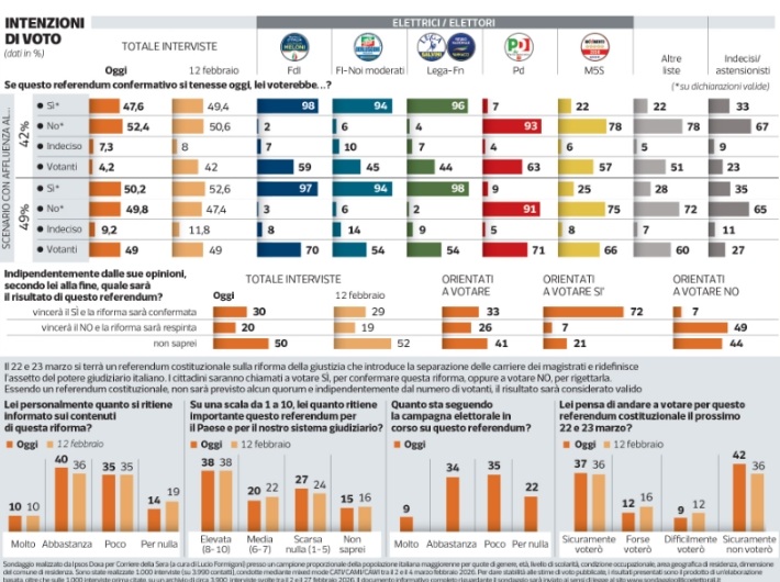 I sondaggi di Ipsos illustrati da Nando Pagnoncelli sul Corriere della Sera dicono che nel referendum sulla riforma della giustizia il no è in vantaggio, mentre il sì può vincere se l’affluenza supera il 49%. Oggi soltanto il 37% è sicuro di recarsi alle urne, un dato in crescita di un solo punto percentuale rispetto a quasi un mese fa. Gli indecisi scendono di 4 punti al 12%. Per questo la previsione sulla partecipazione oggi è sul 42% e potrebbe arrivare fino al 49%.