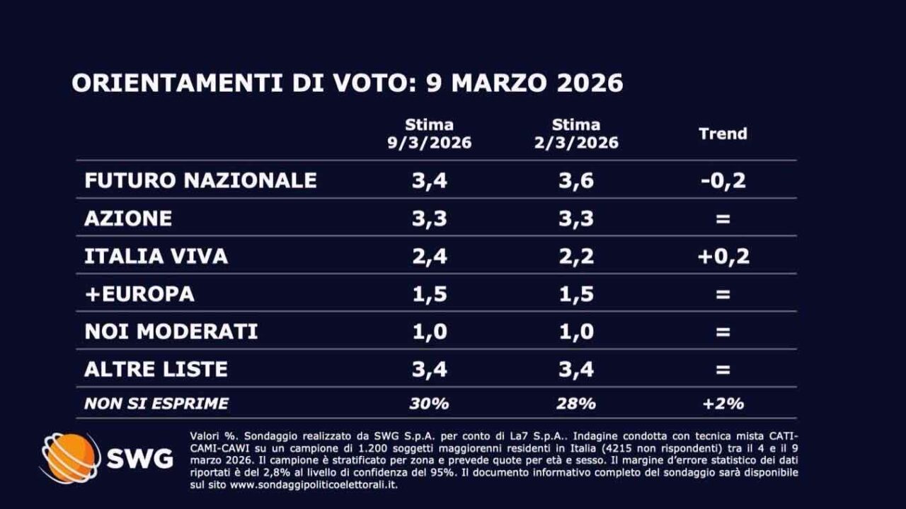 Settimana negativa anche per il generale Roberto Vannacci e il suo Futuro Nazionale, che perde ancora terreno e si porta ora al 3,4$. Stabile Azione al 3,3$, mentre si riavvicina Italia Viva al 2,4%. Nessuna variazione invece per +Europa all’1,5% e Noi Moderati all’1%.