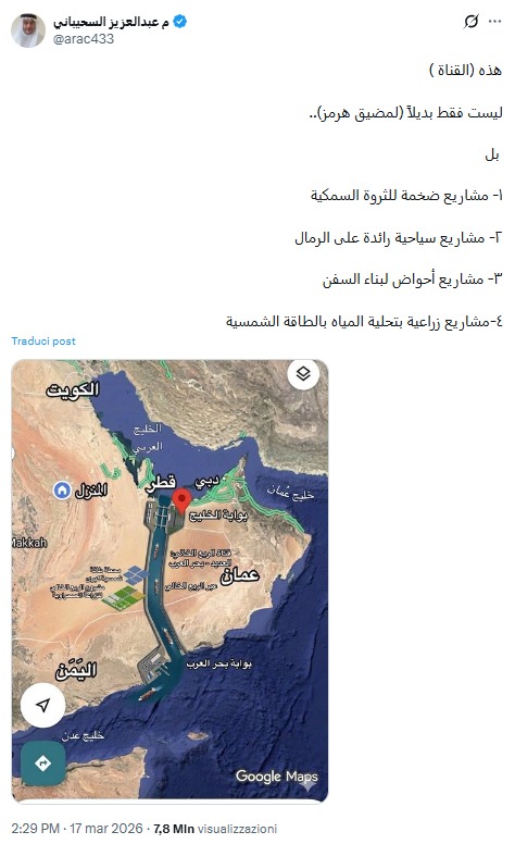 In questo clima di estrema tensione, sui social è balzata la proposta di un canale artificiale di oltre 800 chilometri, rilanciata su X dall’ingegnere saudita Abdulaziz Al-Suhaibani per aggirare il blocco e collegare direttamente il Golfo Persico al Mar Arabico. Un’opera “mastodontica” che, nonostante le oltre 7,8 milioni di visualizzazioni in meno di 24 ore, non è stata presa molto sul serio, scatenando l’ironia del web a colpi di Intelligenza Artificiale.
