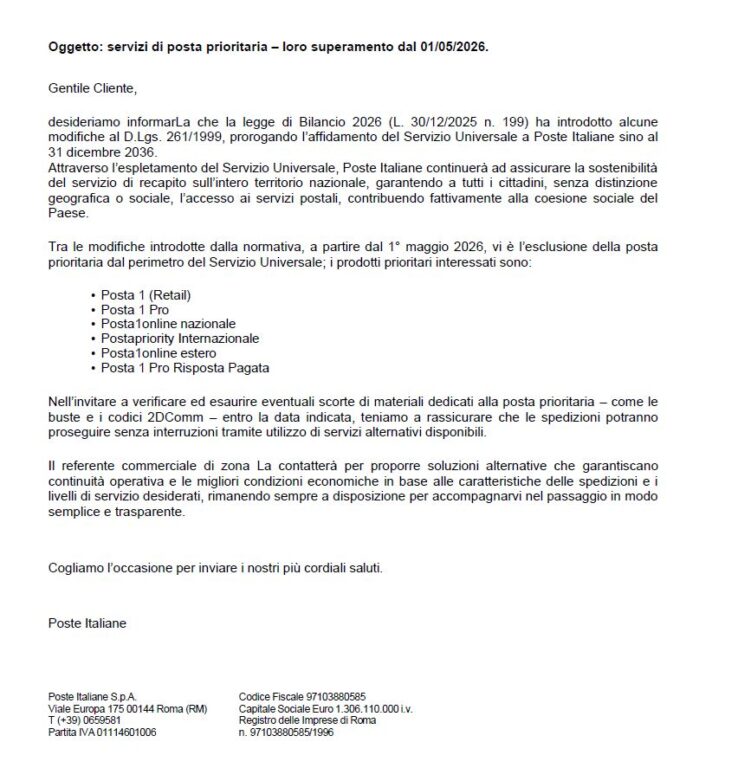 Secondo quanto raccontano diversi venditori online, la comunicazione è arrivata in modo frammentato. Molti di loro hanno ricevuto una email ufficiale indirizzata ai clienti business. Nel testo si legge che «a partire dal 1° maggio 2026 vi è l’esclusione della posta prioritaria dal perimetro del Servizio Universale», con l’elenco dei servizi coinvolti, tra cui proprio Posta1. Una comunicazione formale, che però non ha ridotto l’incertezza tra gli operatori. «All’inizio ci dicevano che non era sicuro», spiega Calzineri. «Poi è arrivata la conferma con una circolare e infine sul sito ufficiale. Ma parliamo di un mese e mezzo di preavviso: in questo settore è niente».
