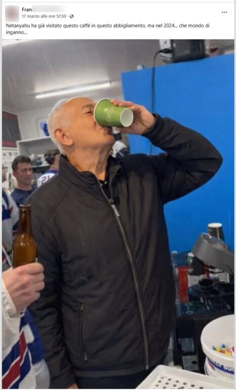 L’immagine viene condivisa con la seguente descrizione: «Netanyahu ha già visitato questo caffè in questo abbigliamento, ma nel 2024… che mondo di inganno…».